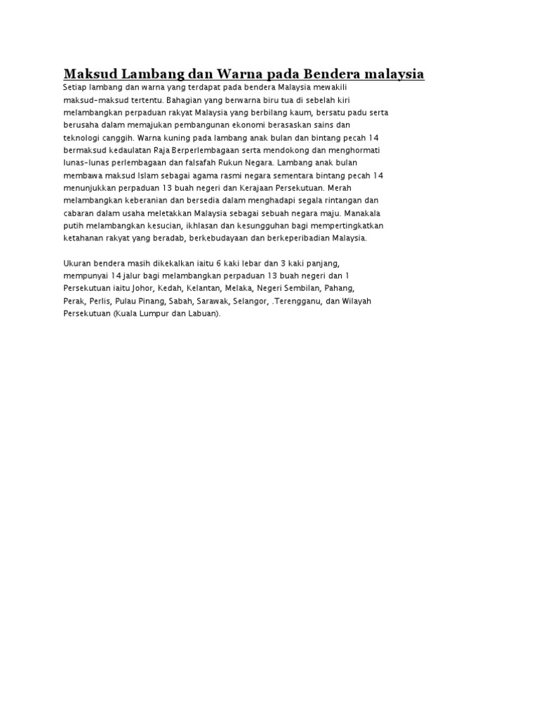 Maksud lambang dan warna pada Bendera Malaysia from imgv2-1-f.scribdassets.com Bendera malaysia mengandungi 14 jalur merah dan putih. Jata negara malaysia merupakan salah satu daripada identiti negara malaysia selain daripada bendera jalur gemilang dan lagu kebangsaan. Warna putih melambangkan keluhuran dan keikhlasan. Menunjukkan simbul islam sebagai agama rasmi negara malaysia. Penciptaan bendera persekutuan tanah melayu telah diilhamkan melalui satu pertandingan mereka cipta bendera peringkat kebangsaaan pada mei 1948. Maka, setiap lambang dan warna yang digunakan menonjolkan maksud tertentu. بنديرا مليسيا) atau nama rasminya jalur gemilang (jawi: Tahukah anda maksud lambang dan warna pada jalur gemilang?
